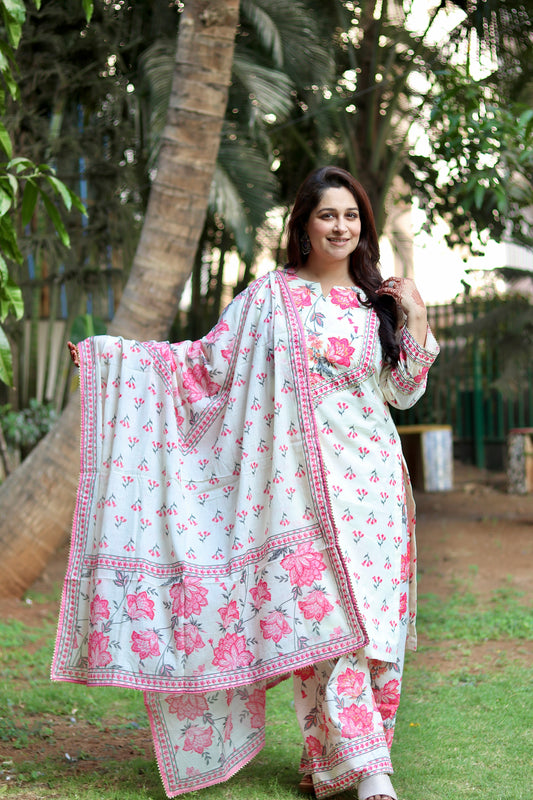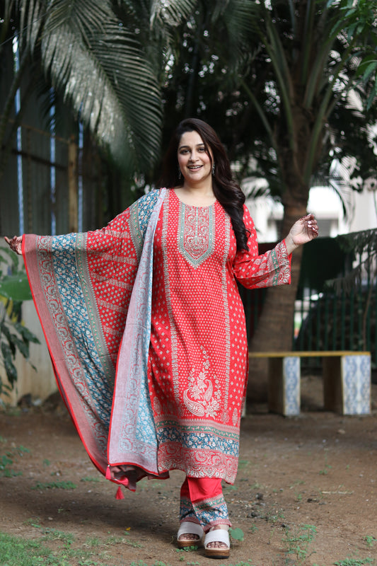 Bold, timeless, and effortlessly elegant — the Kaaya Noir Set redefines classic charm through modern craftsmanship. Made from luxurious printed muslin silk, this flared Anarkali features a graceful high round neckline and full-length sleeves, offering both sophistication and ease.