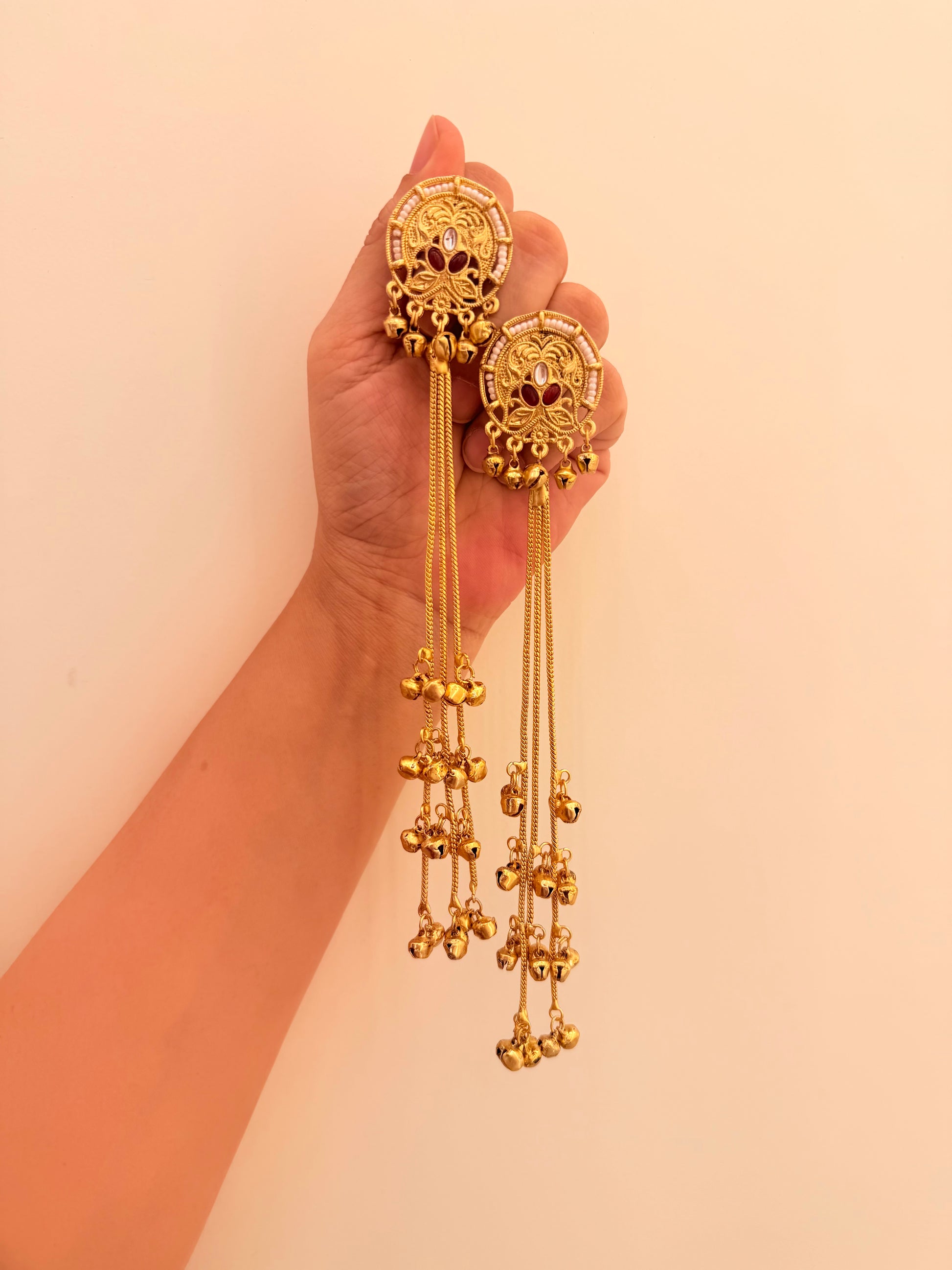 Regal and refined, Ameera is an ode to timeless royalty. With its intricately carved motif and delicate ghungroo-adorned tassels, this piece radiates vintage grandeur. The subtle touch of Red at the center adds a graceful contrast, making Ameera perfect for those who love jewellery that speaks of elegance, heritage, and charm.