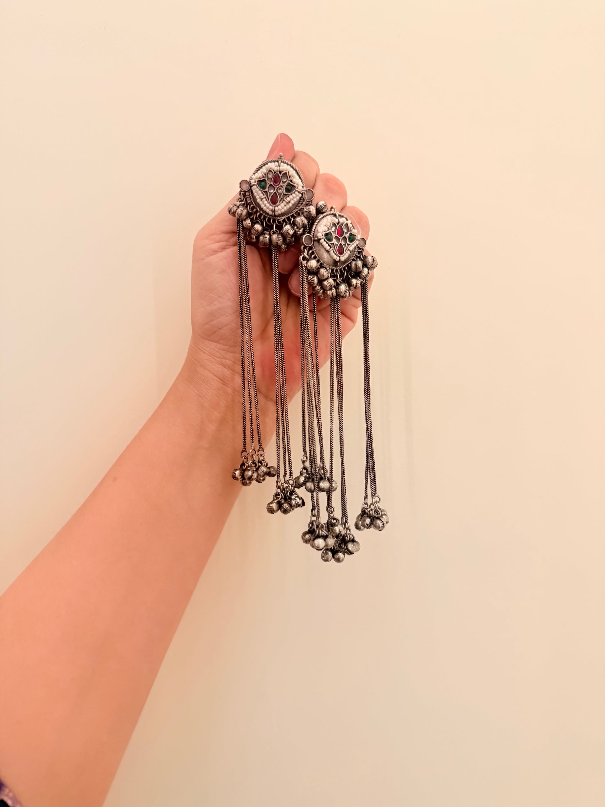 Echo Strings embodies the rhythm of tradition in a modern form. With its oxidized detailing, tiny ghungroo clusters, and flowing chains, this piece moves gracefully — creating a soft, melodic charm that complements every look with effortless poise.