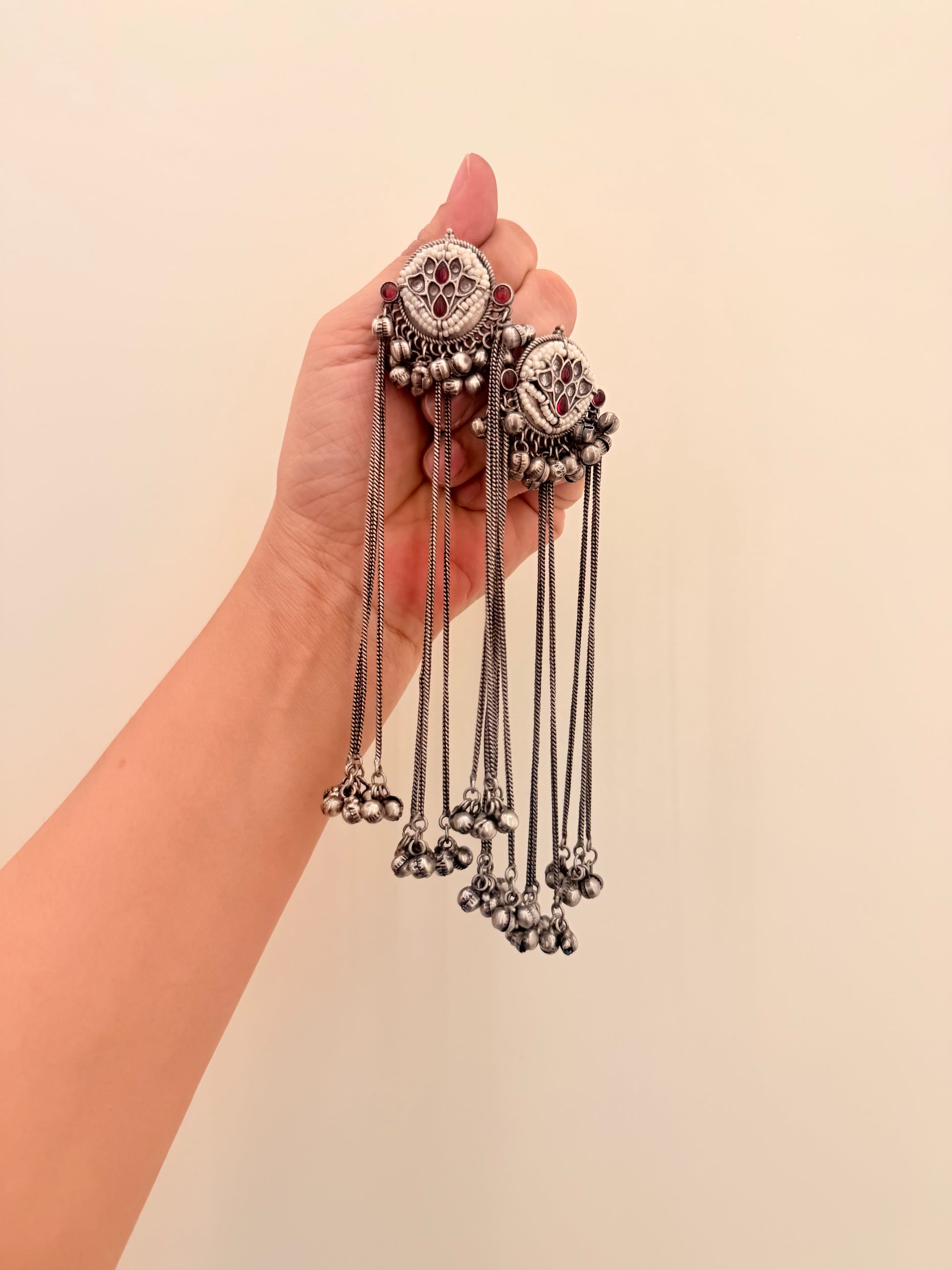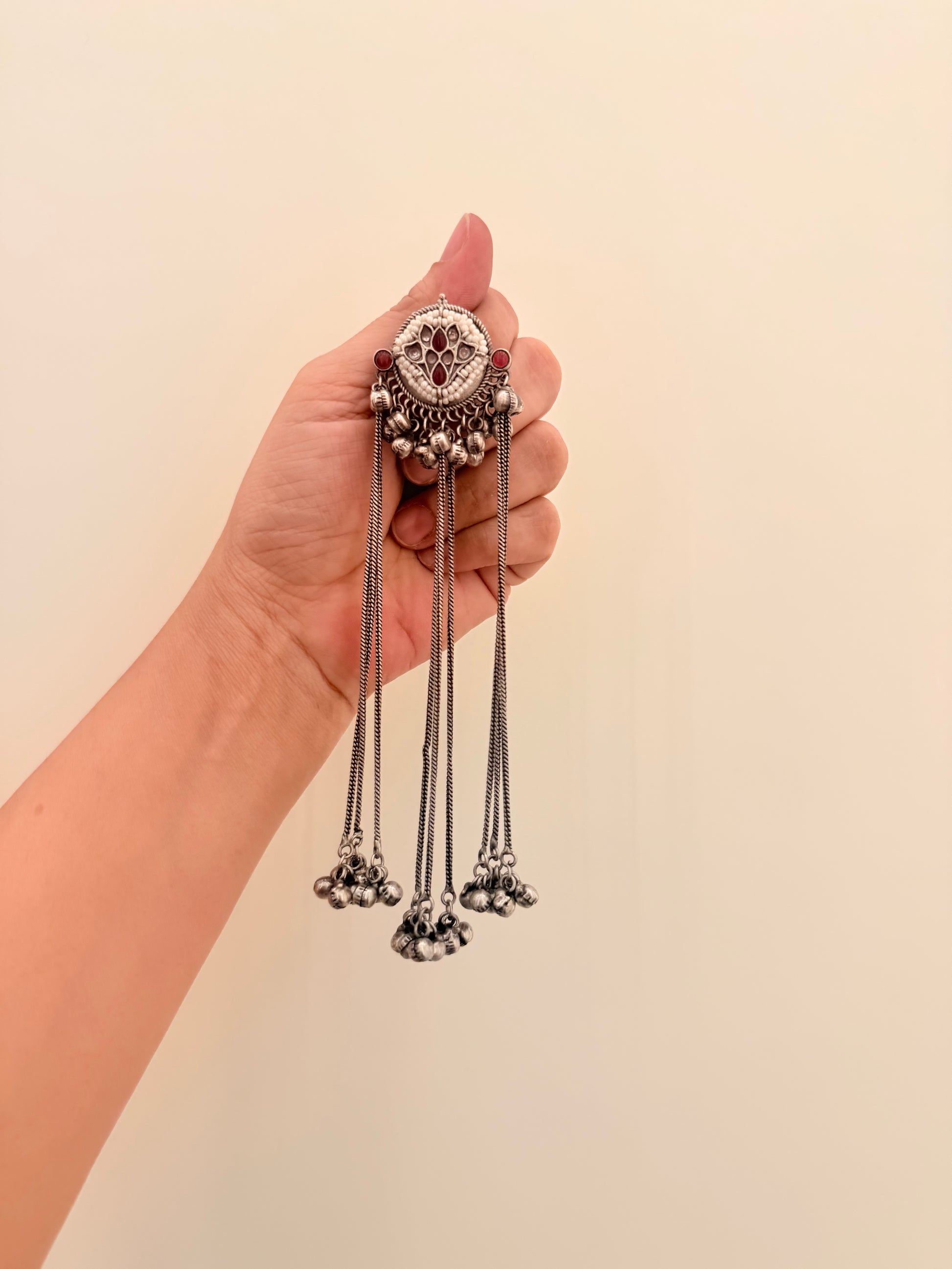 Echo Strings embodies the rhythm of tradition in a modern form. With its oxidized detailing, tiny ghungroo clusters, and flowing chains, this piece moves gracefully — creating a soft, melodic charm that complements every look with effortless poise.