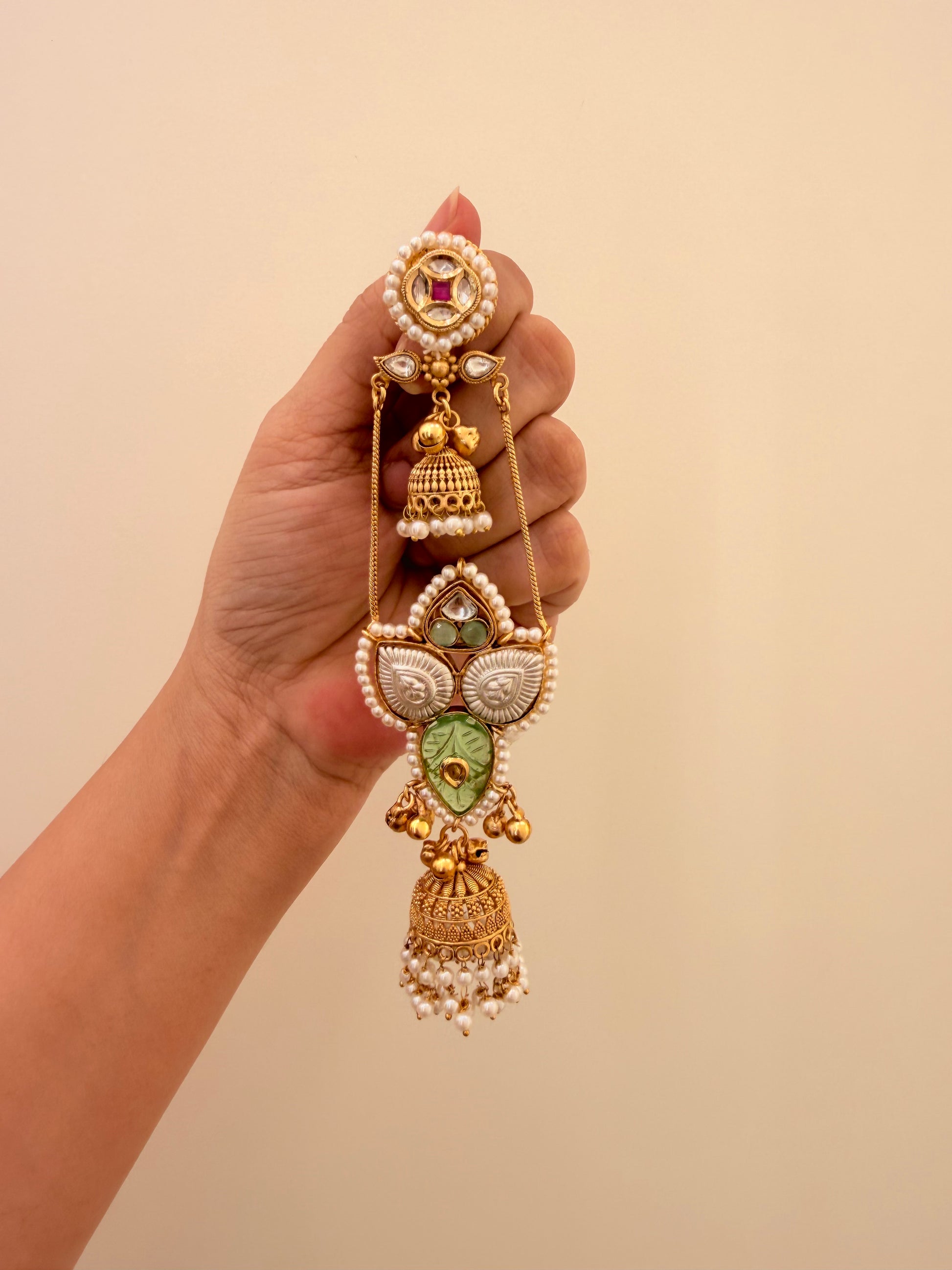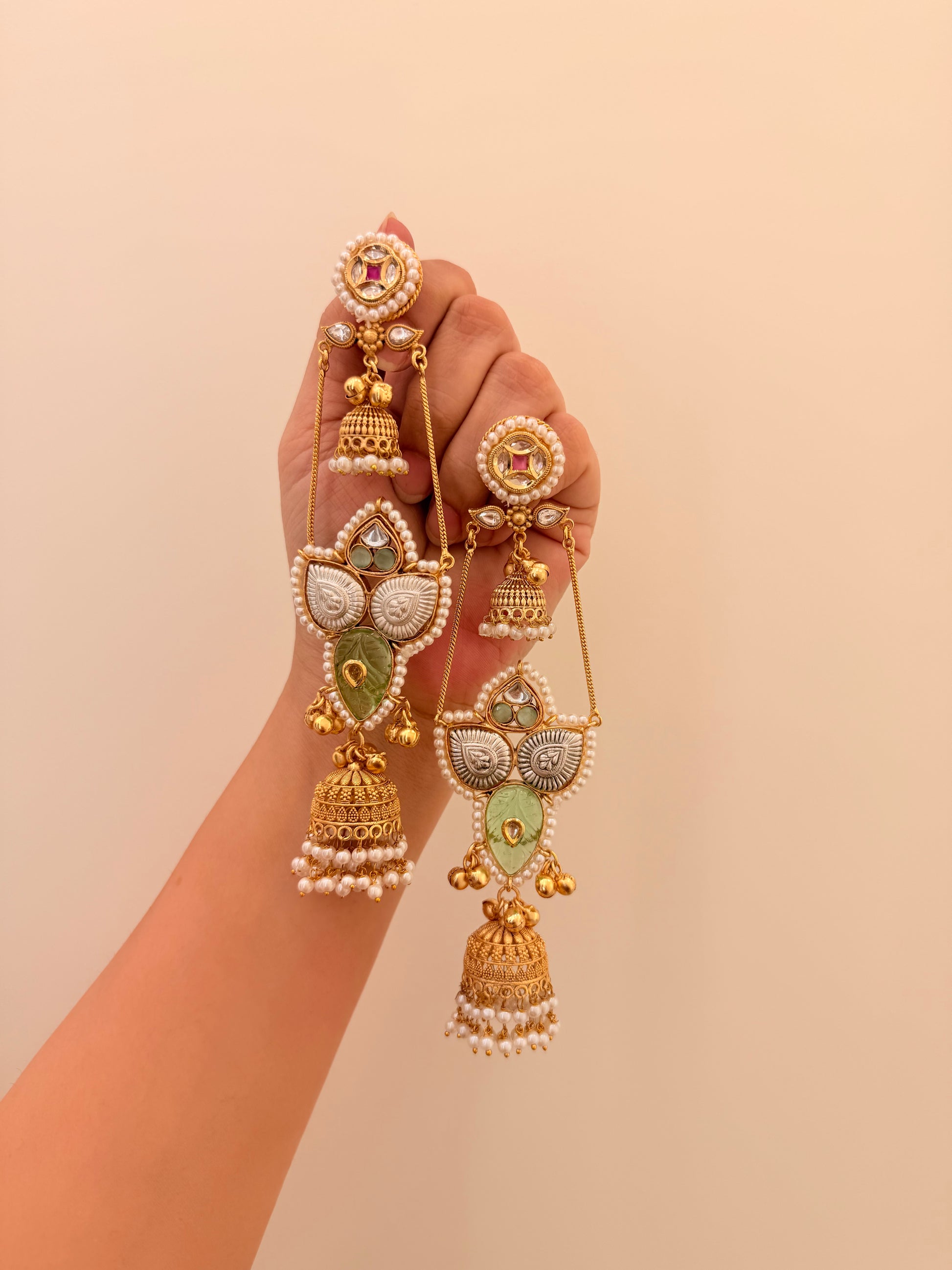 The Meenaz Earrings are long and graceful, with a small jhumka at the top connected by delicate strings to the jhumkas below. Every sway creates a rhythmic dance, blending intricate craftsmanship with elegant movement for a look that is both striking and timeless.