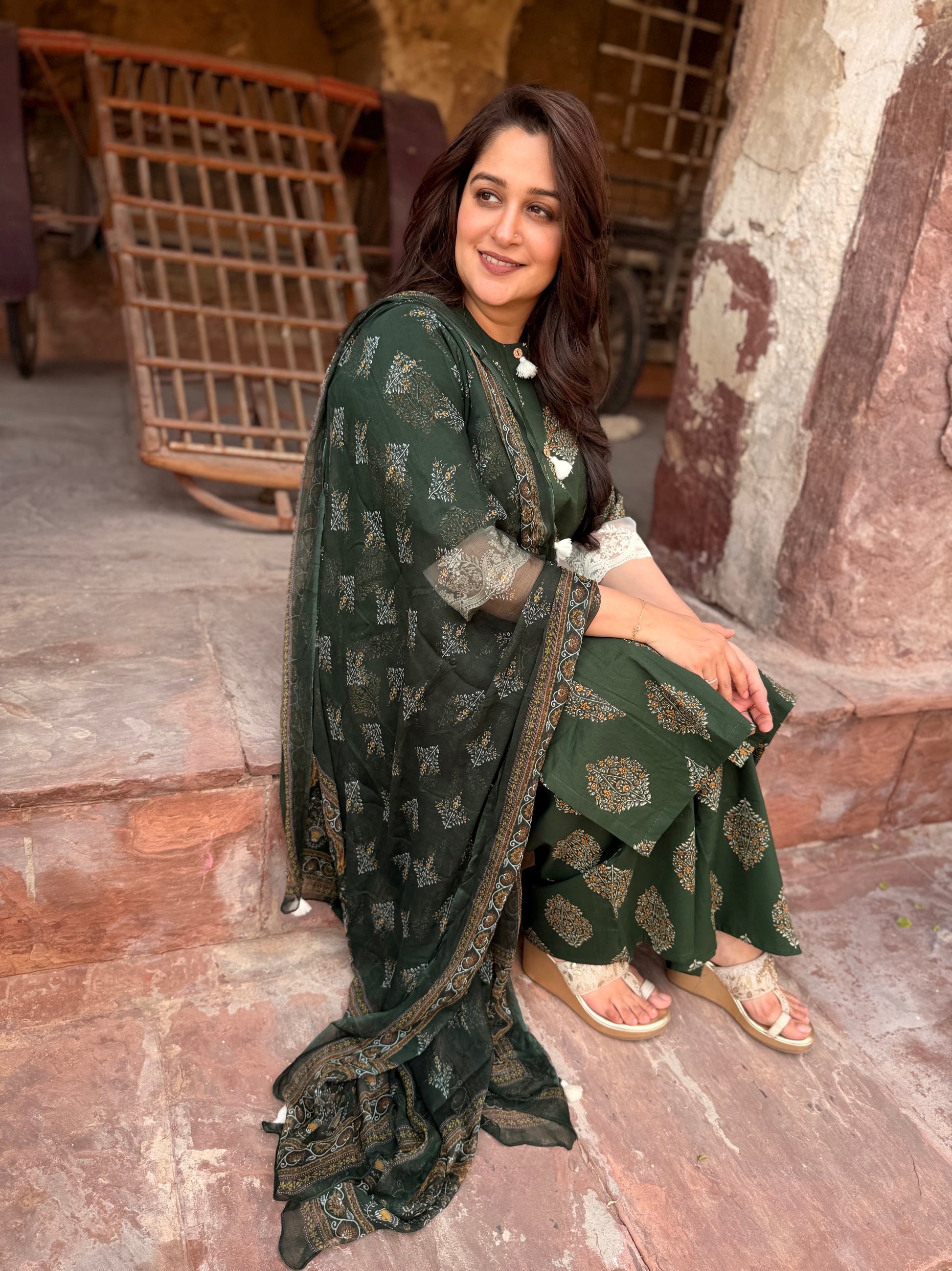 • Print Style: It features Ajrakh-inspired block prints. The repeating geometric and floral motifs in indigo and cream are characteristic of the traditional hand-block printing technique originating from Sindh, Gujarat, and Rajasthan.