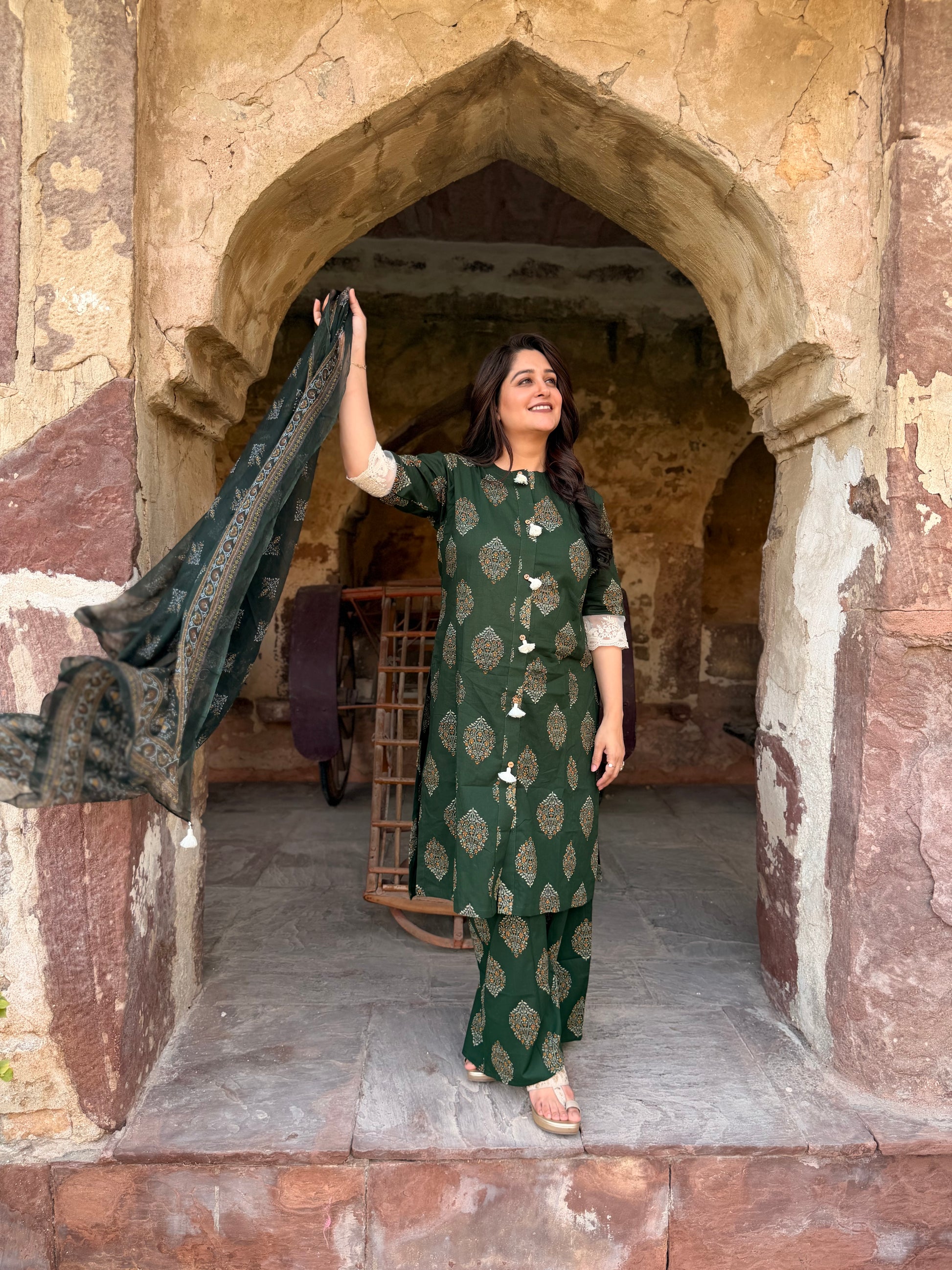 • Fabric & Color: The set is a deep green a classic shade often associated with natural dyes.