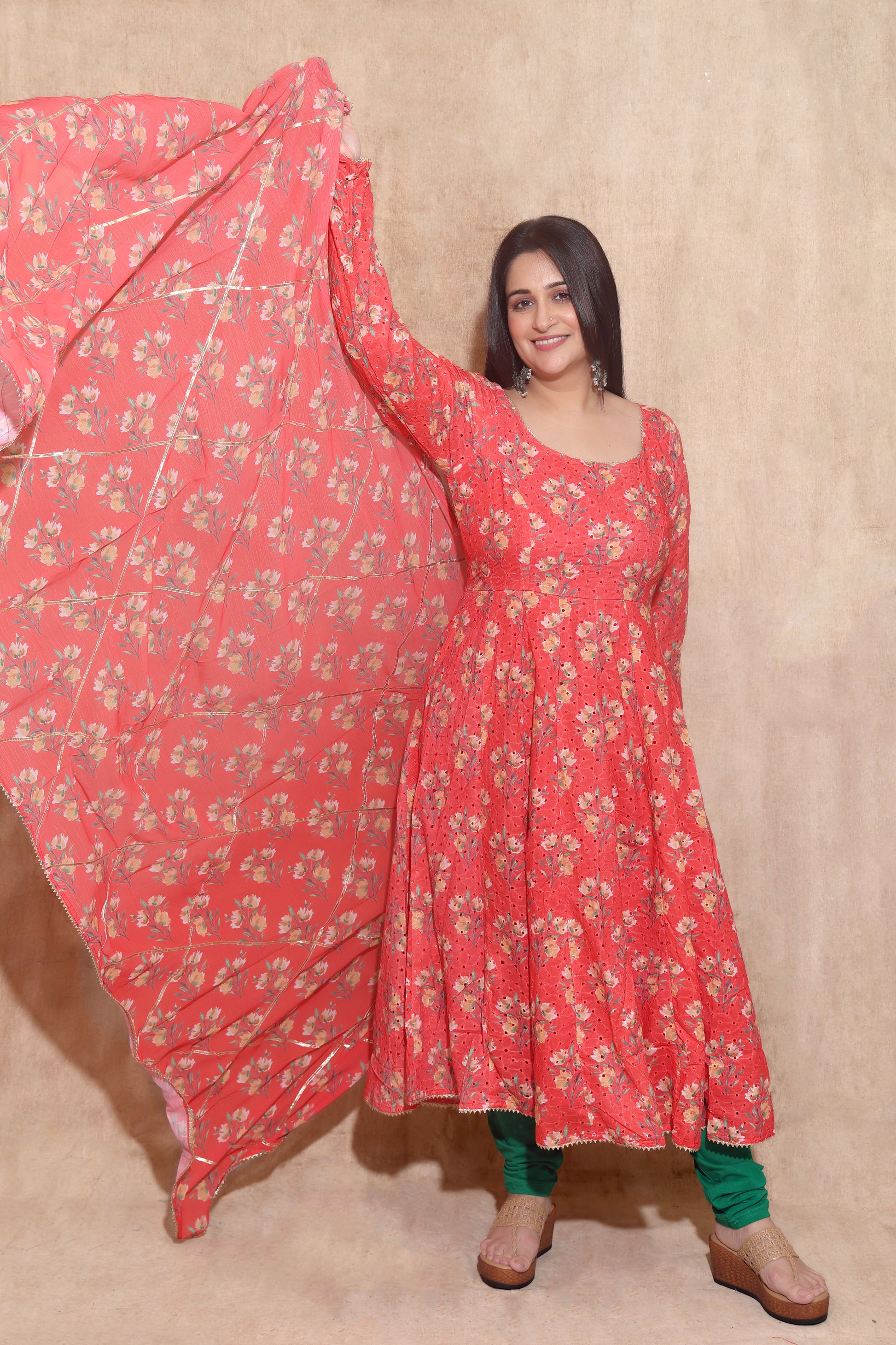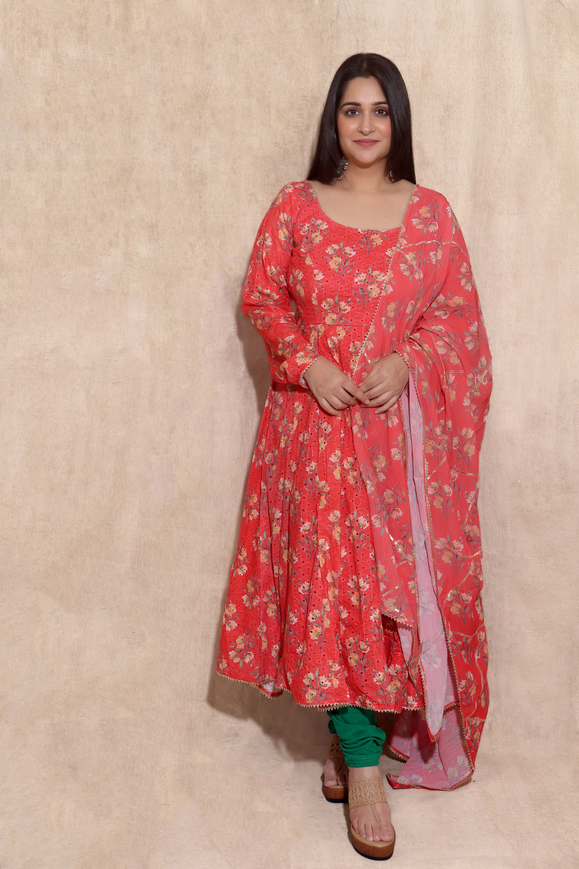A body cut Anarkali with floral print all over and a matching dupatta. Its graceful, comfortable, and perfect for any occasion.