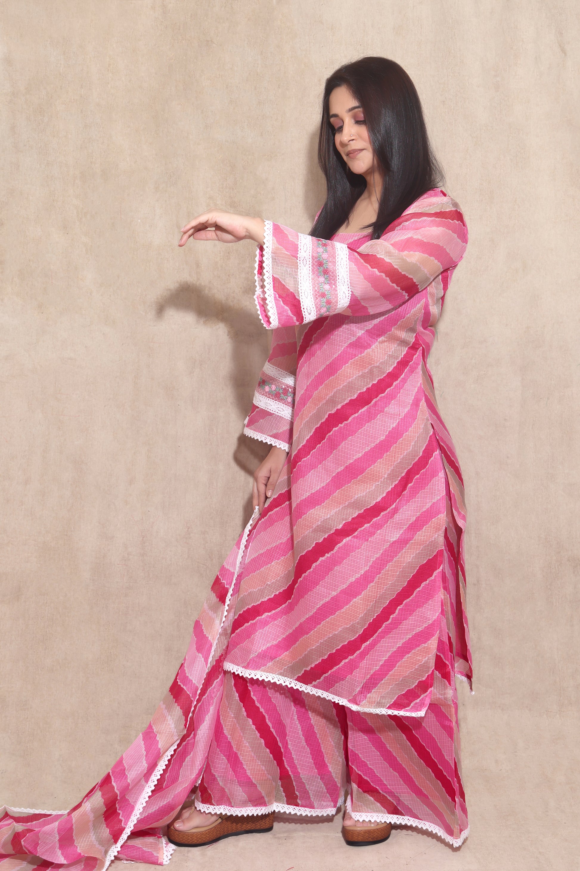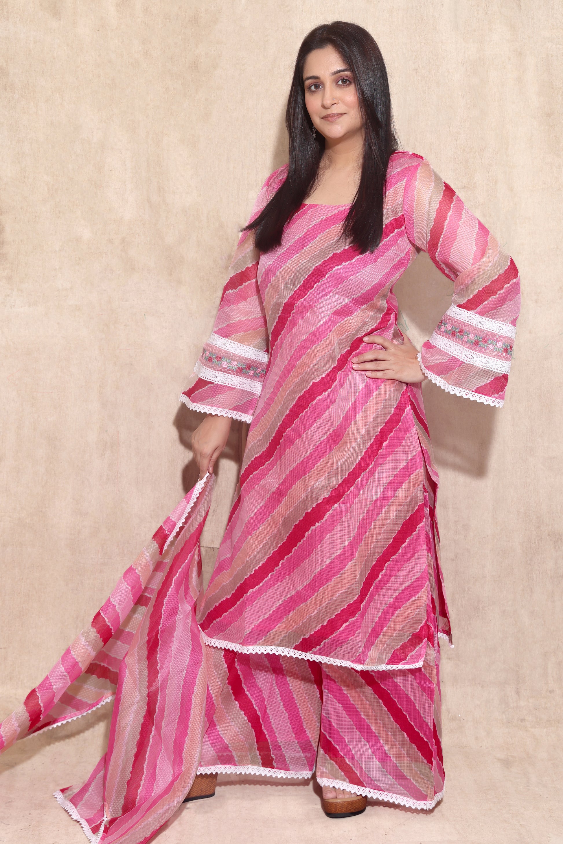 A straight-fit kurta with flared palazzos and a dupatta in the classic lehariya print. The beautiful flared sleeves add a touch of elegance to this outfit. Easy to carry, this outfit is very comfy and elegant to wear.