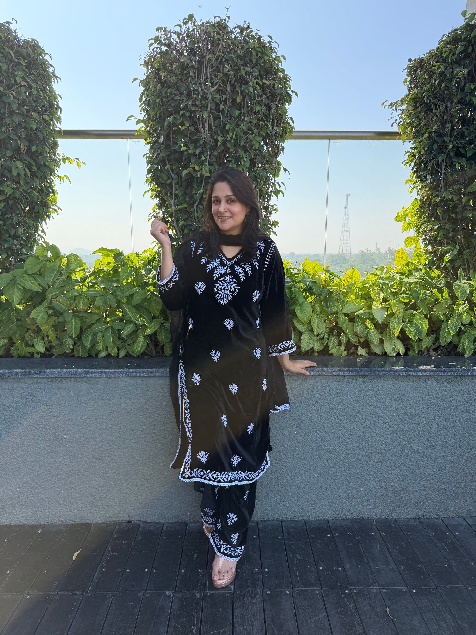 Velvet Kurta Set With Lucknowi Chikankari embroidery.
