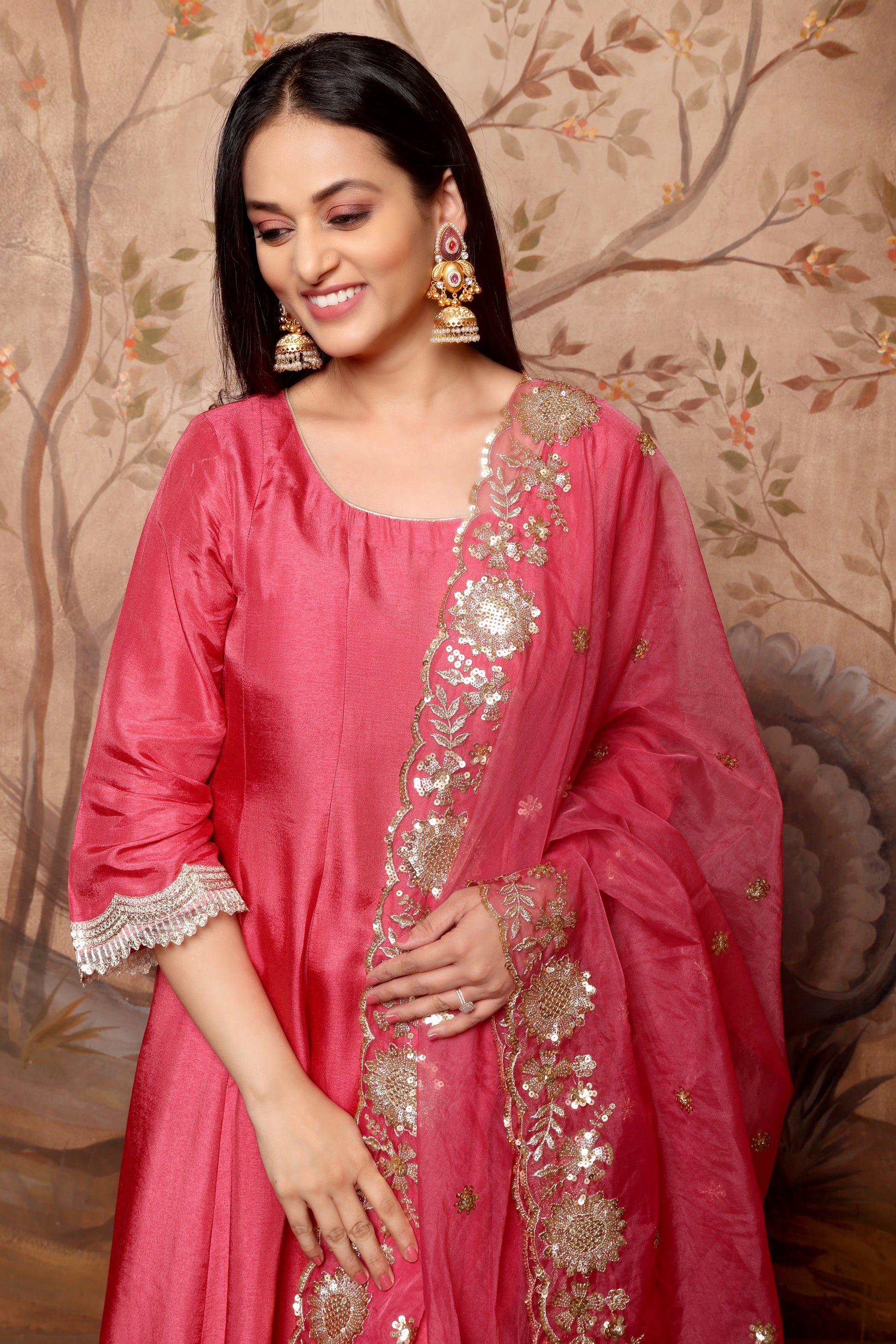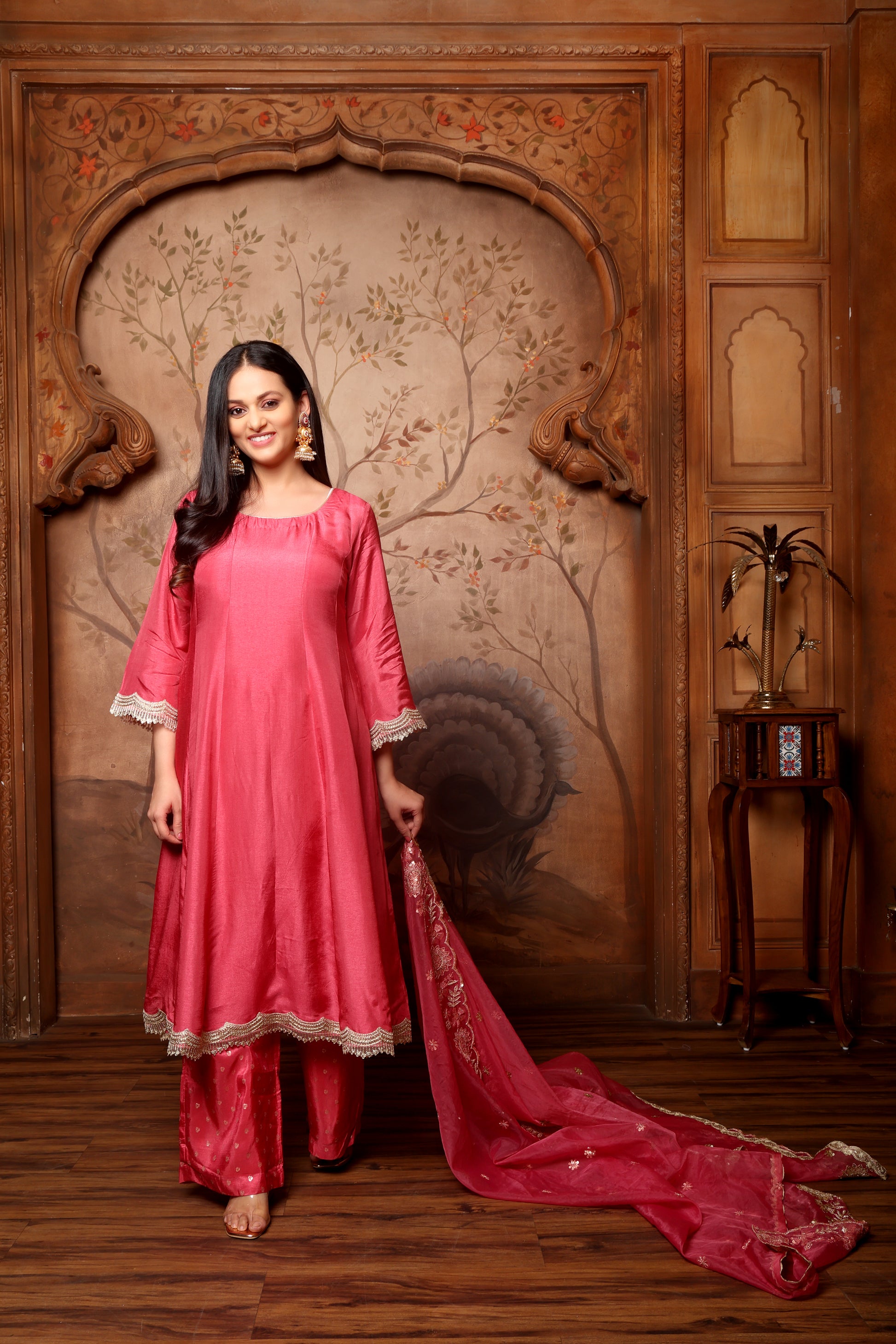 Graceful, refined, and radiating warmth — the MeherRouge Ensemble celebrates understated luxury through its soft silhouette and delicate details. Crafted in premium Russian silk, the Anarkali-style kurta features a subtle sheen and a fluid fall, paired with matching Russian silk bottoms that ensure comfort with elegance. The three-quarter flared sleeves are accentuated with lace-edged cuffs, adding a touch of intricate charm.