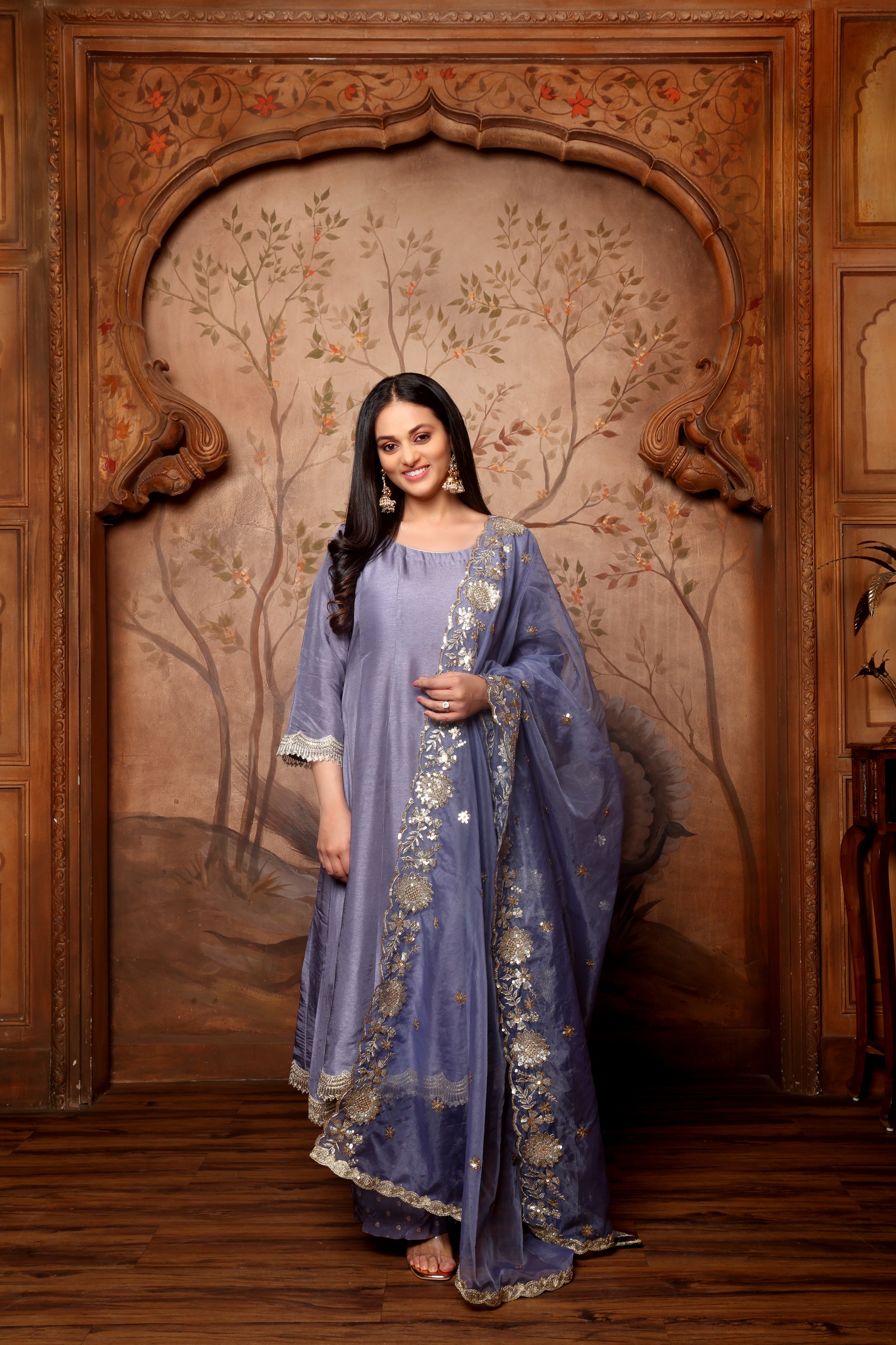Graceful, refined, and radiating warmth — the MeherRouge Ensemble celebrates understated luxury through its soft silhouette and delicate details. Crafted in premium Russian silk, the Anarkali-style kurta features a subtle sheen and a fluid fall, paired with matching Russian silk bottoms that ensure comfort with elegance. The three-quarter flared sleeves are accentuated with lace-edged cuffs, adding a touch of intricate charm.