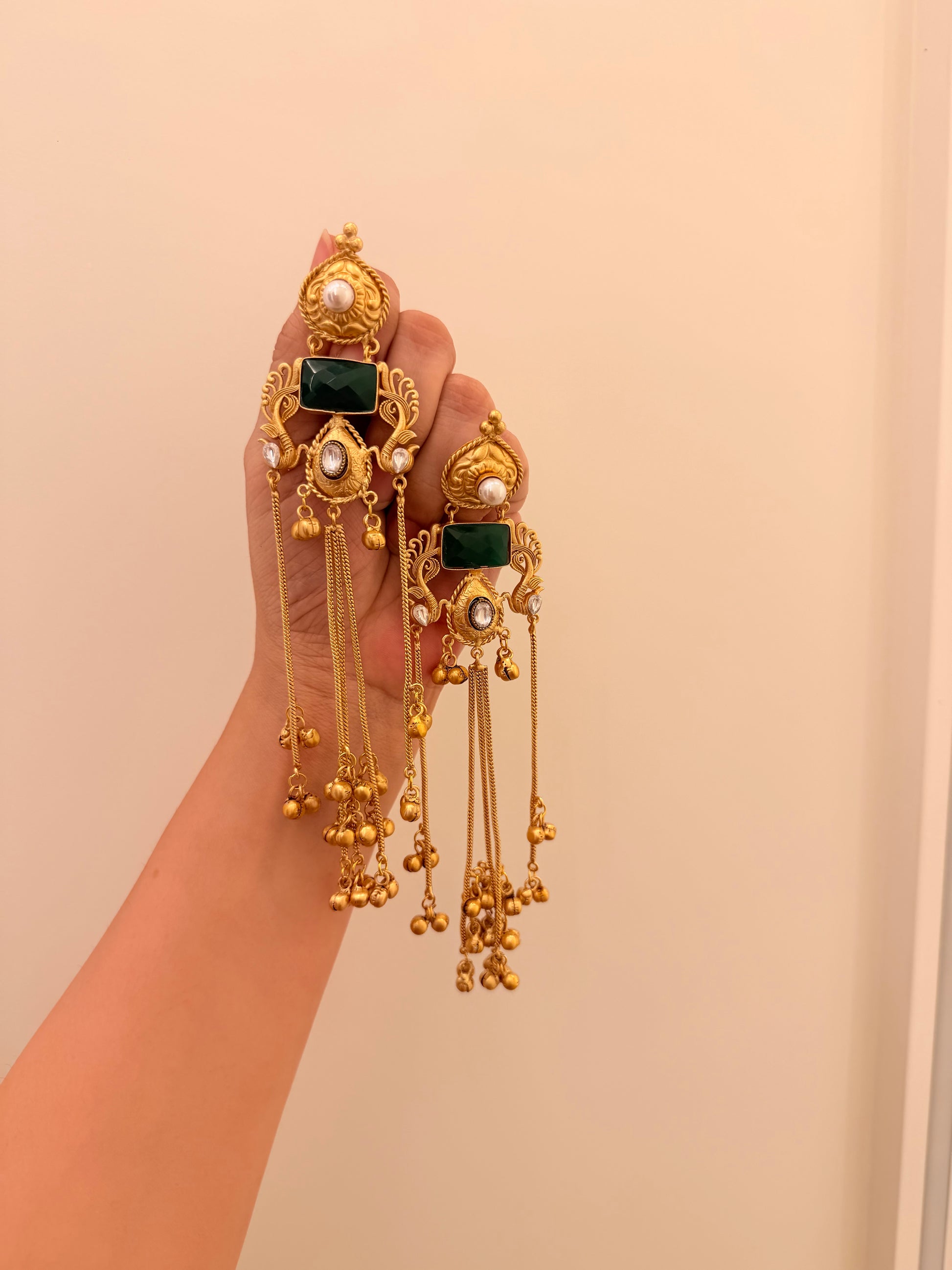 The Nazakat Earrings shine with a golden stud and a green-stone centrepiece detailed in gold, flowing into jhumkis that add charm to every gesture.