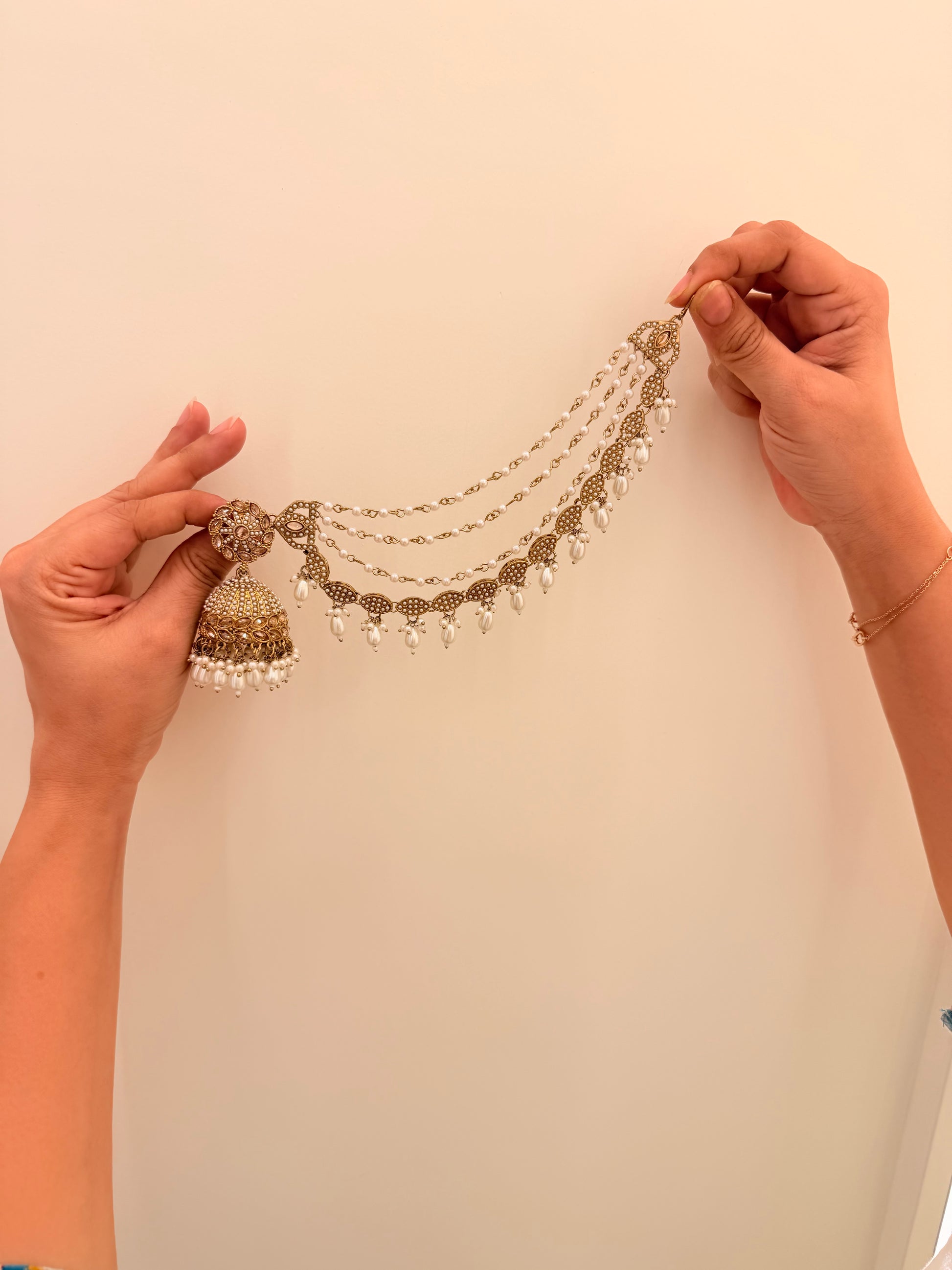 A timeless blend of color, pearls, and artistry — Nazneen Jhumka captures festive elegance with its intricate design work and cascading pearl chains, radiating grace with every movement.
