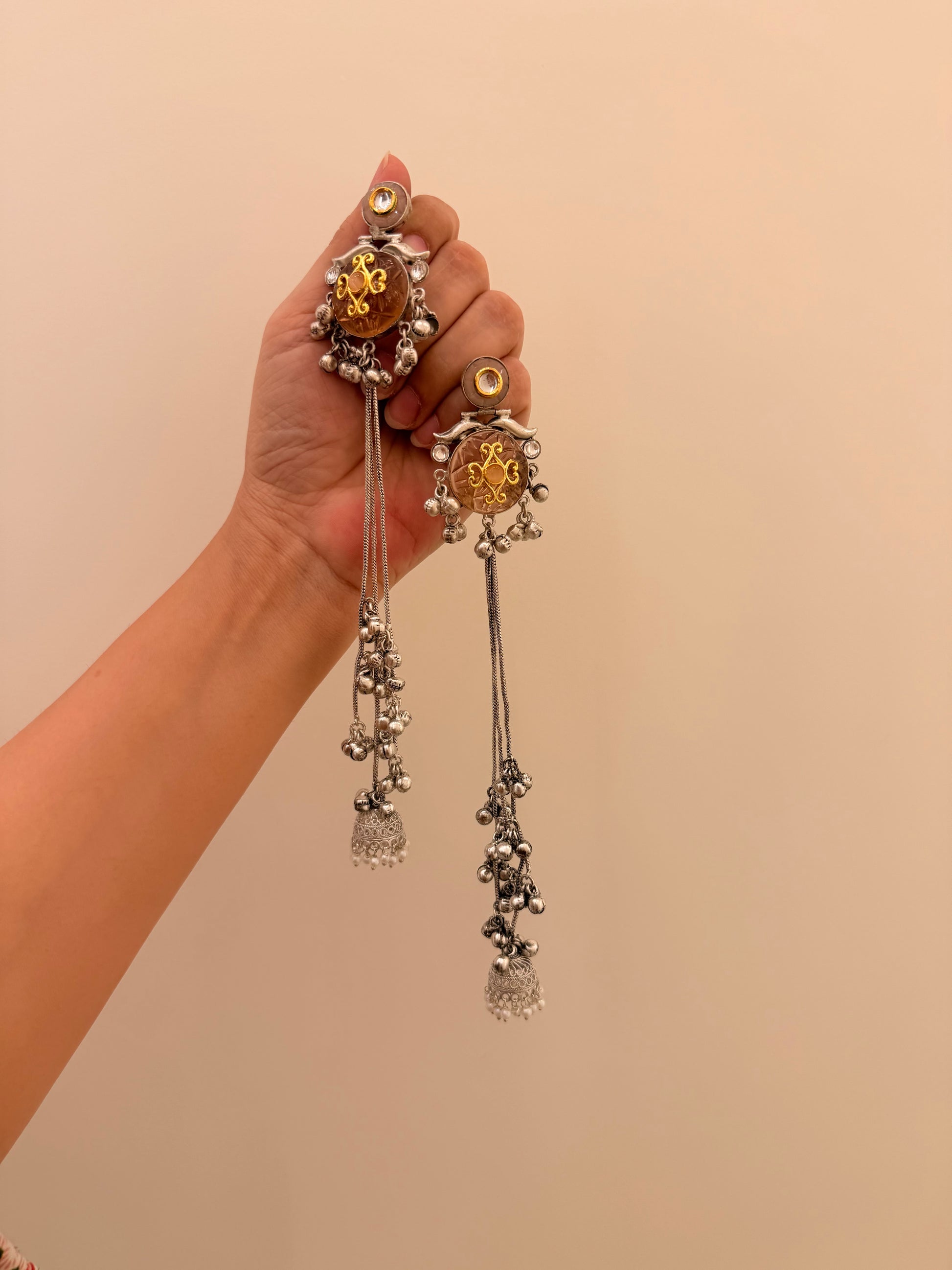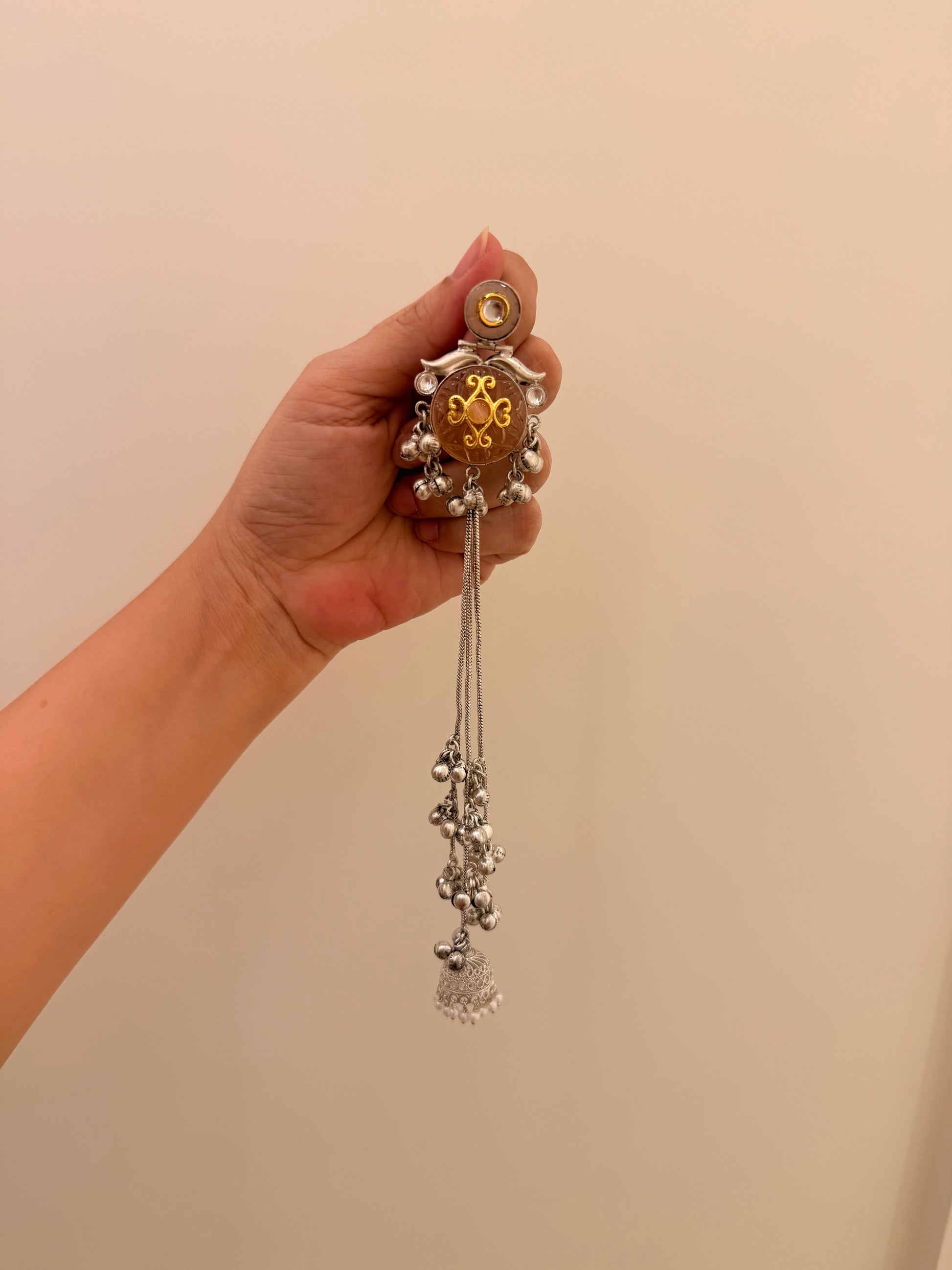 A single sparkling stone crowns the Noor-R-Ghungroo studs, leading to a delicately crafted centerpiece that holds the design together. Graceful chains dangle below, each adorned with tiny ghungroos that tinkle softly with every movement, turning every gesture into a melody of elegance and charm.
