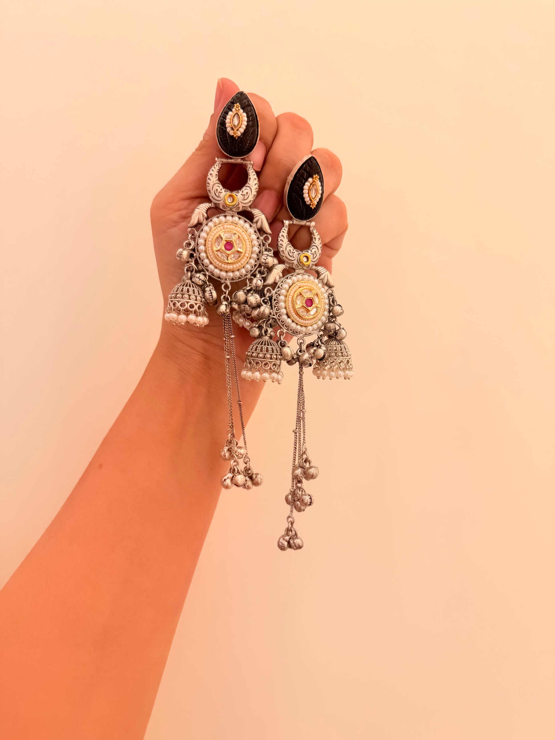 A striking fusion of oxidised artistry and pearl-studded grace, Noorvi Tassels bring together intricate motifs and playful ghunghroo chains. Elegant yet bold, they’re crafted to make a statement with every sway.