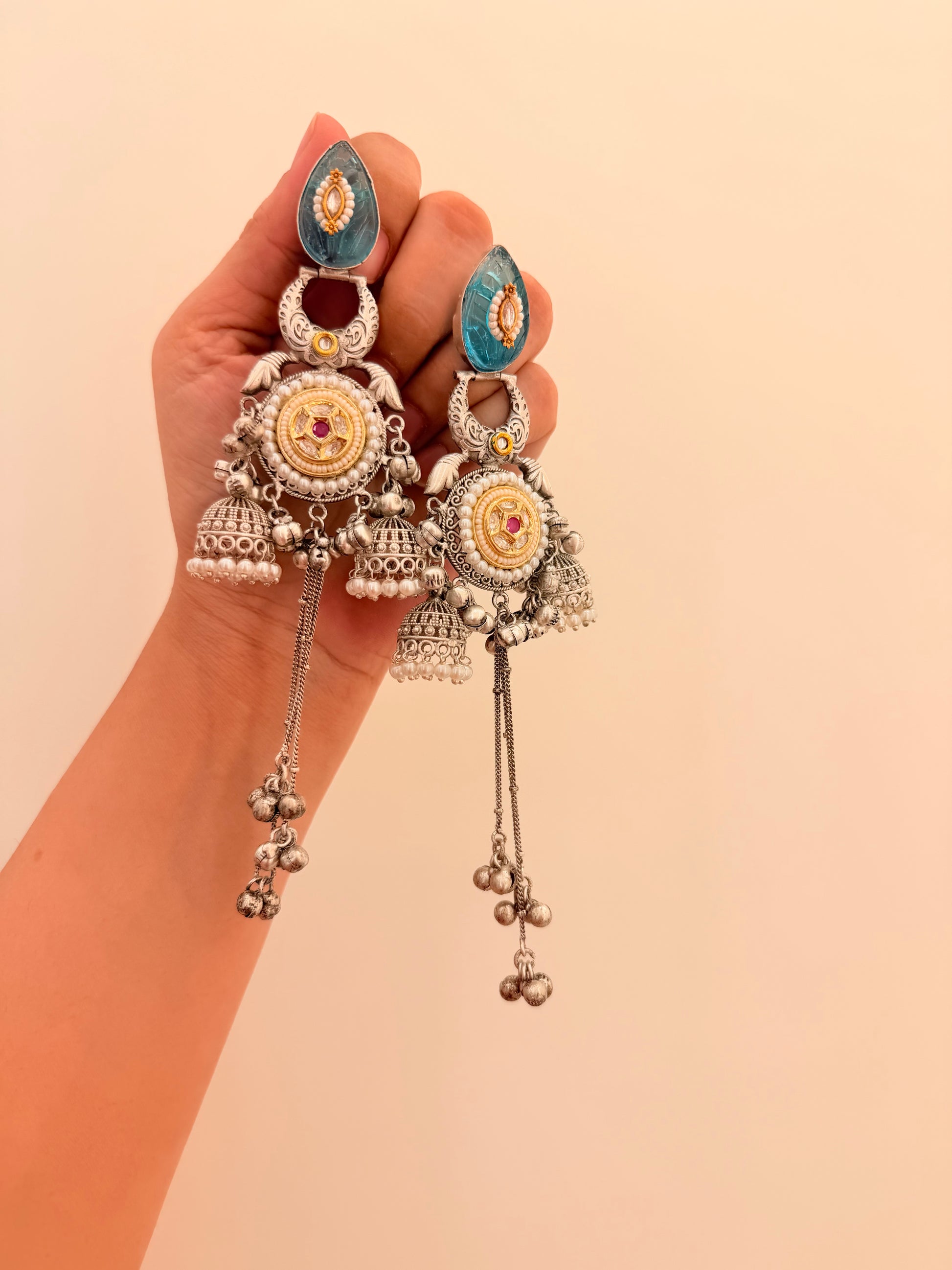 A striking fusion of oxidised artistry and pearl-studded grace, Noorvi Tassels bring together intricate motifs and playful ghunghroo chains. Elegant yet bold, they’re crafted to make a statement with every sway.