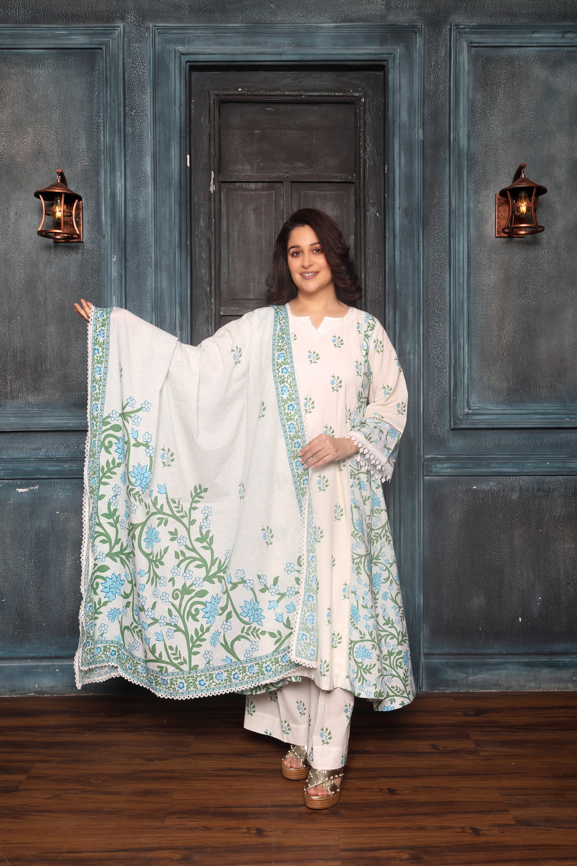 Completing the ensemble is the luxurious mul-cotton dupatta, digitally printed to match the kurta, beautifully finished with lace detailing on all sides for a refined, lightweight drape. Perfect for festive gatherings, day functions, or elegant casual outings.