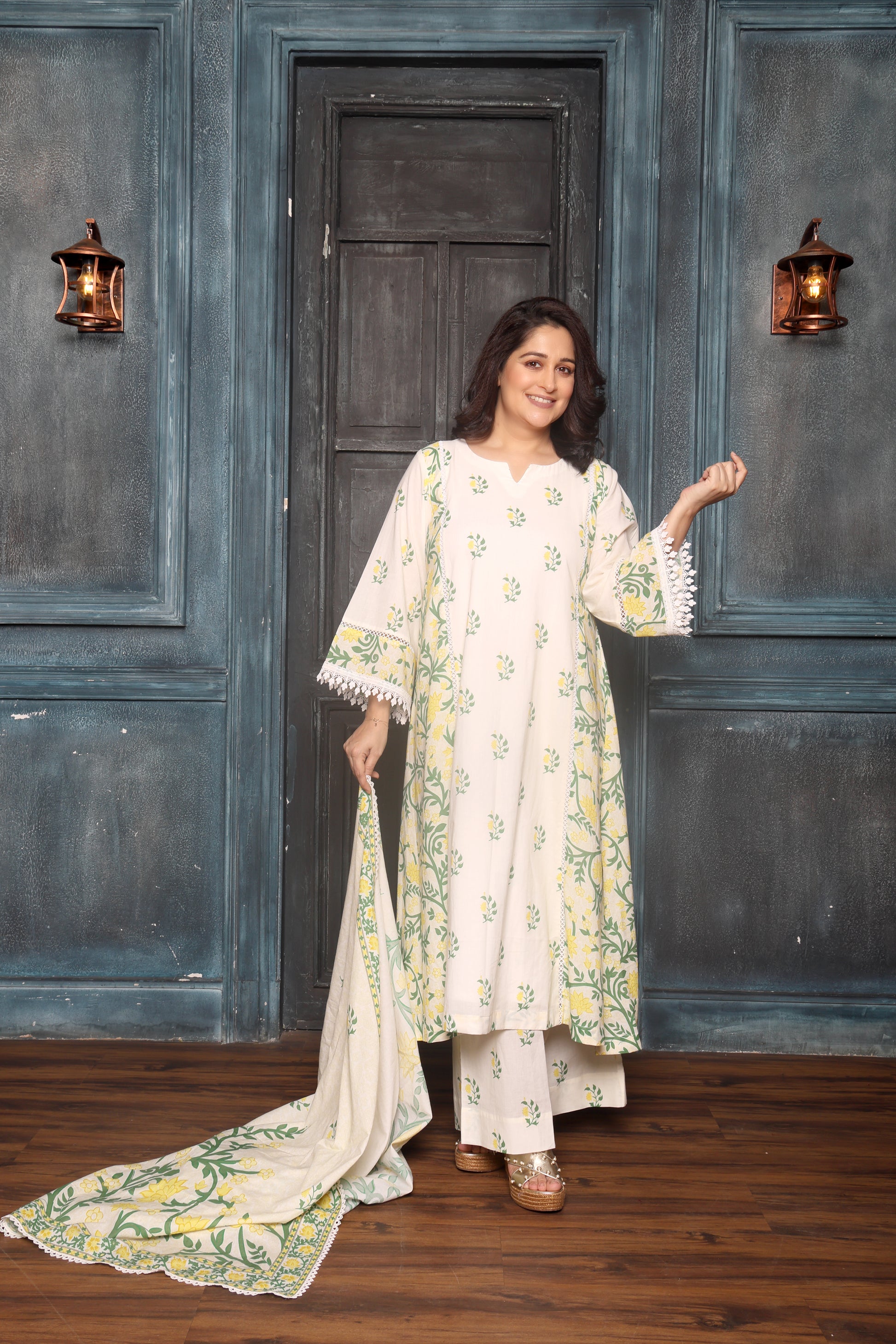 Completing the ensemble is the luxurious mul-cotton dupatta, digitally printed to match the kurta, beautifully finished with lace detailing on all sides for a refined, lightweight drape. Perfect for festive gatherings, day functions, or elegant casual outings.