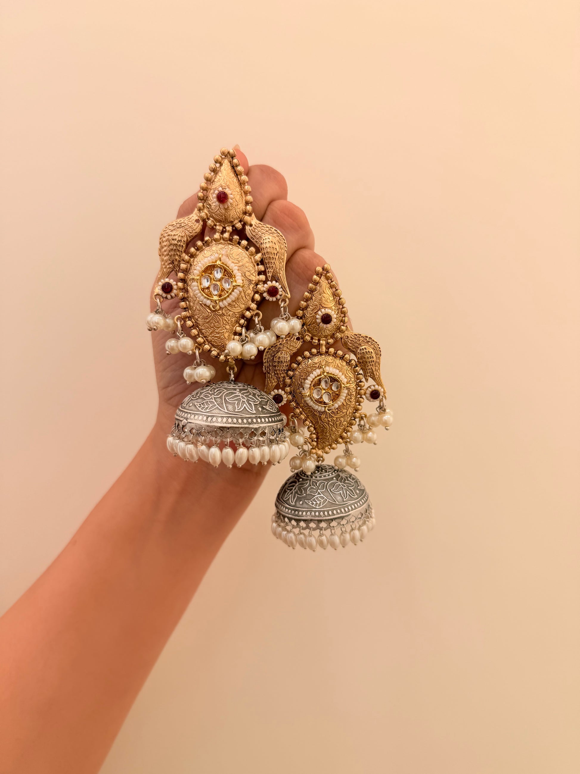 The Suroor Jhumkas blend gold and silver in perfect harmony, with a golden upper design flowing into a silver jhumka. Delicate floral-inspired details at the center add grace, while the jhumka dances lightly, reflecting a delicate rhythm of elegance.